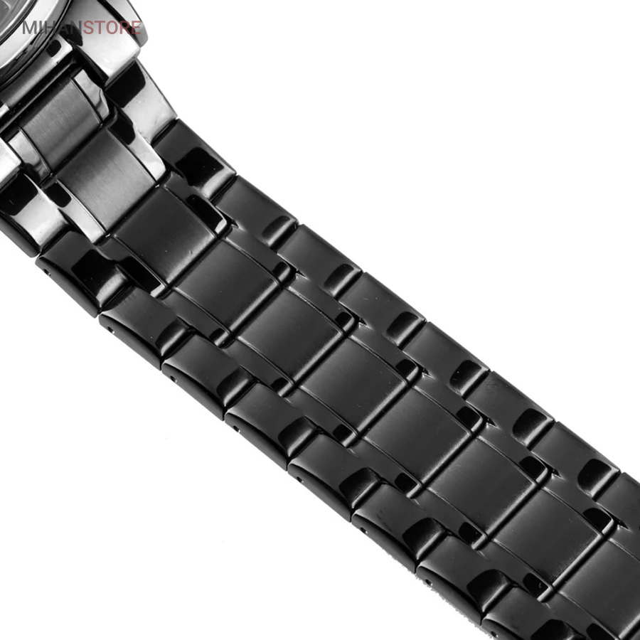 تنها یک ابزار زمانسنجی نیست؛ بلکه اکسسوریایست که استایل و شخصیت را همزمان بازتاب میدهد. طراحی نیمهاسکلتون صفحه، با جزئیات مکانیکی و حس صنعتی، در ترکیب با رنگ مشکی یکدست بدنه، بند و صفحه، ظاهری مدرن، قدرتمند و متمایز به این ساعت بخشیده است. بدنهی استیل مقاوم و بند استیل مشکی، آن را به گزینهای کاربردی برای موقعیتهای روزمره، رسمی، ورزشی یا استایل فشن تبدیل کرده است.